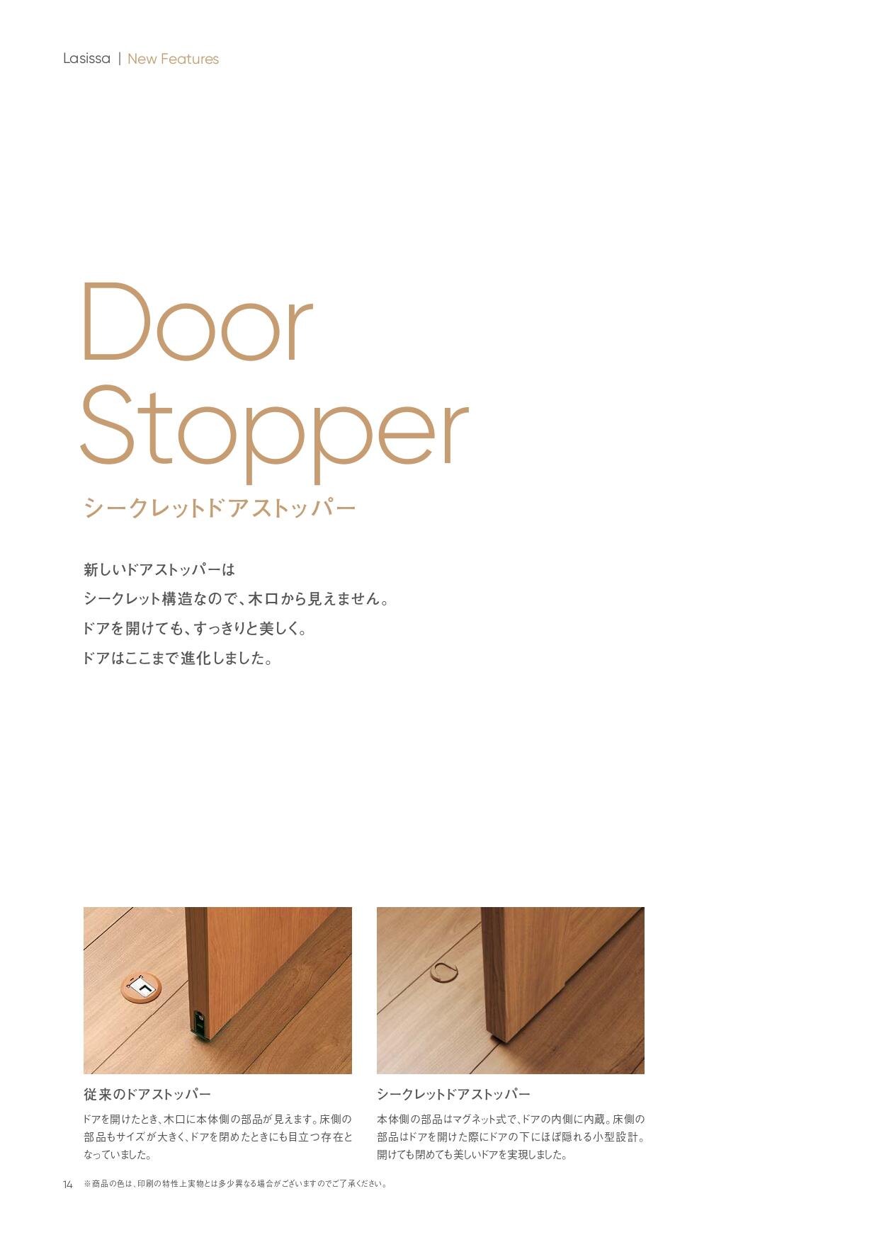 従来のドアストッパーは、ドアを開けた際木口に本体側の部品が見えていましたが、この「シークレットドアストッパー」はドアの内側に部品が内蔵されているため、木口から見えない設計になっていました!また、仮保持機能がついたことにより、かがんでロックをかけたり解除したりする動作が不要に^_^デザイン性も機能性も抜群に向上されていましたよ~!