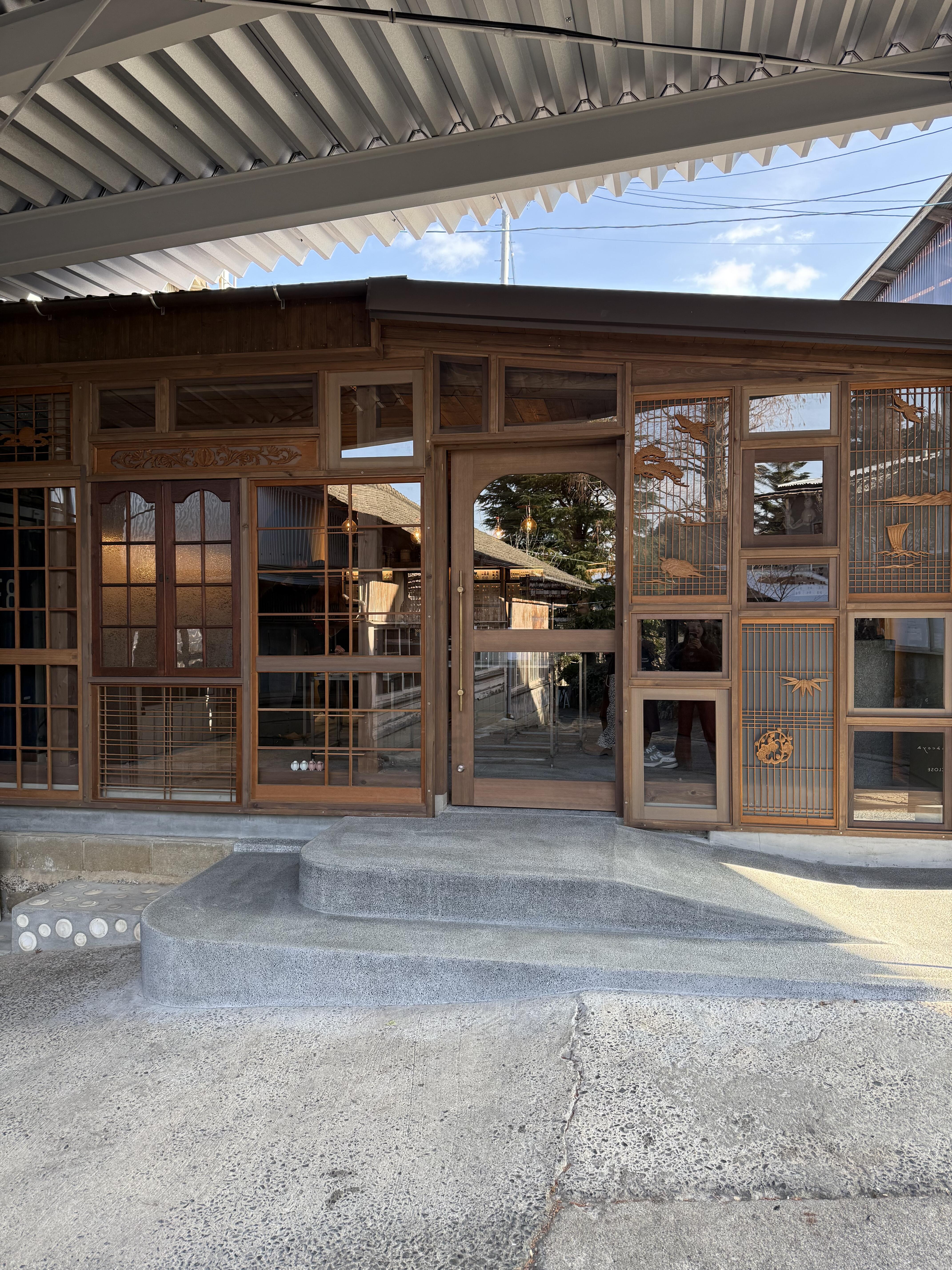 それ以上に心を惹かれたのが、お店の外観です。入口の一面に、欄間や書院がたくさんはめ込まれていて、とても印象的でした。