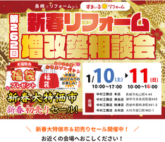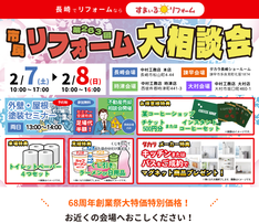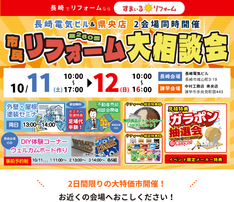 【会場①】すまいるリフォーム 中村工務店 本店/長崎市松山町4-44 、【会場②】すまいるリフォーム 中村工務店 県央店/諫早市多良見町囲443 、【会場③】すまいるリフォーム 中村工務店 時津店/西彼杵郡時津町浦郷 441-3 、【会場④】すまいるリフォーム 中村工務店 大村店/大村市坂口町460-2