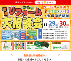 【会場①】クリナップ長崎ショールーム/長崎市御船蔵町2-3 長崎駅前電気ビル 1F 、【会場②】すまいるリフォーム 中村工務店 県央店/諫早市多良見町囲443 、【会場③】すまいるリフォーム 中村工務店 時津店/西彼杵郡時津町浦郷 441-3 、【会場④】すまいるリフォーム 中村工務店 大村店/大村市坂口町460-2