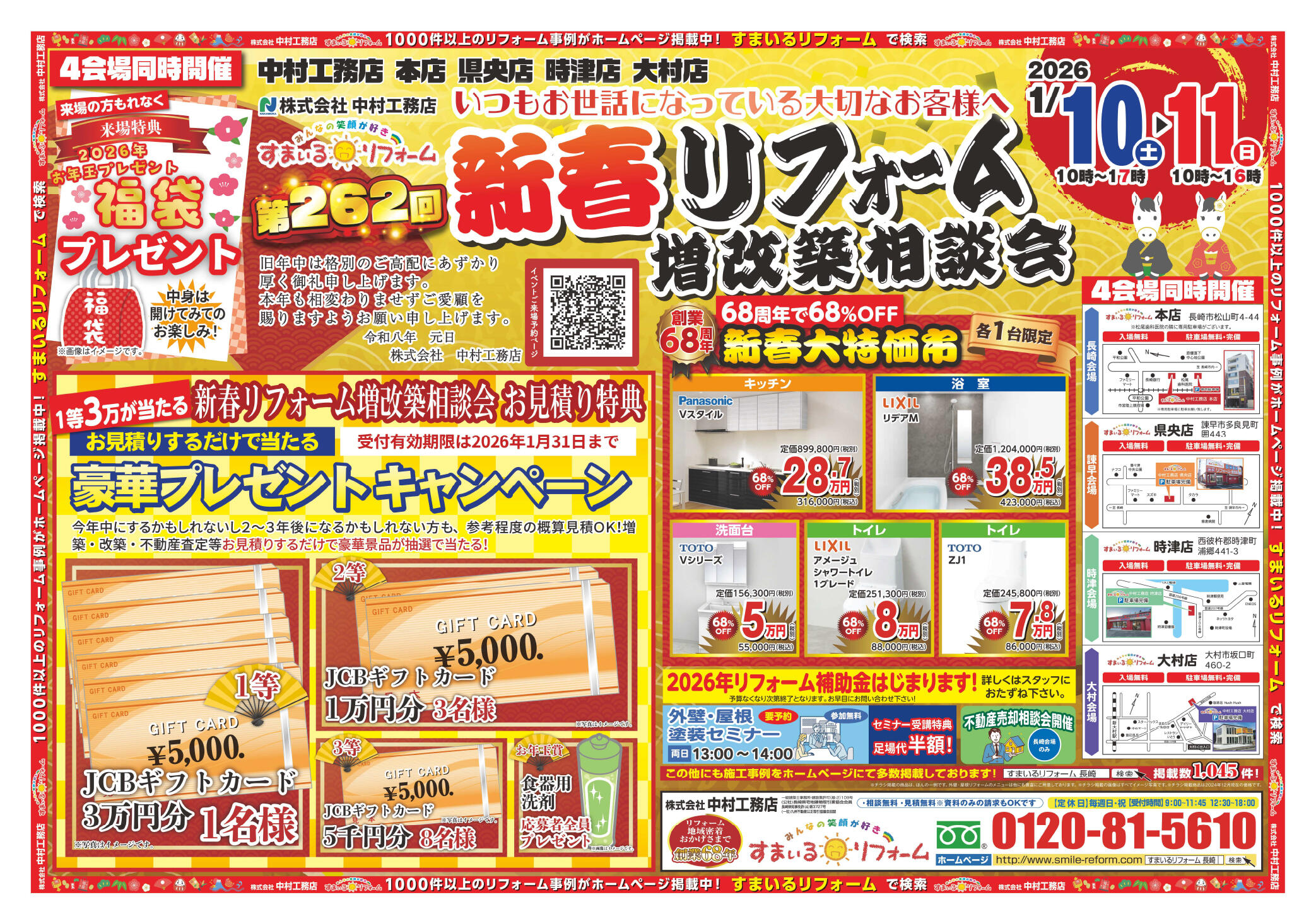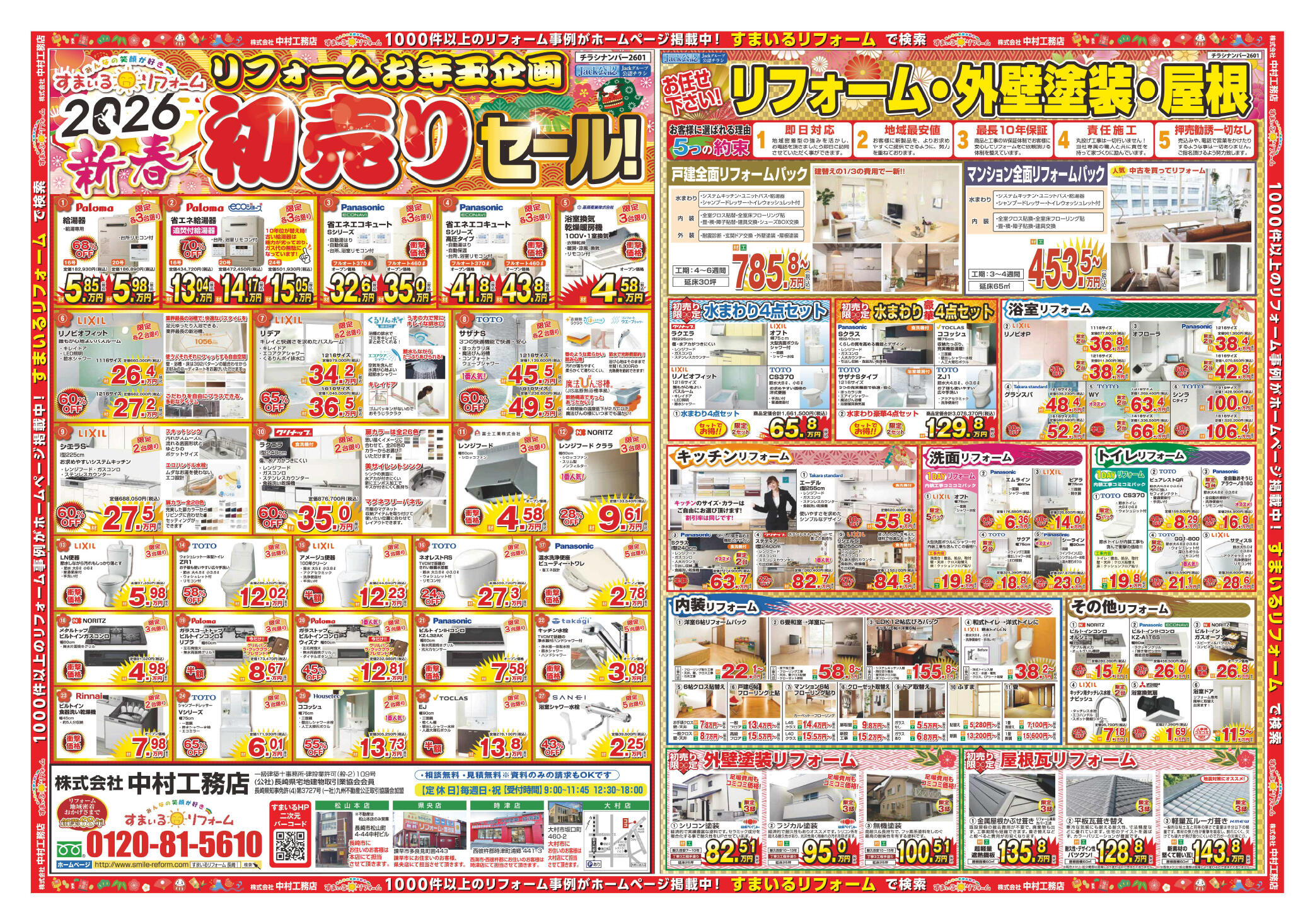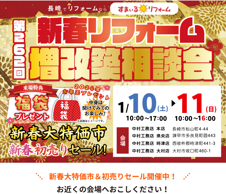 新春大特価市開催!中村工務店 本店&県央店&時津店&大村店でお得な商品を多数ご用意しております。トイレ、洗面化粧台、キッチン、浴室などの水まわりや、その他リフォームをご検討の方はぜひご相談ください!