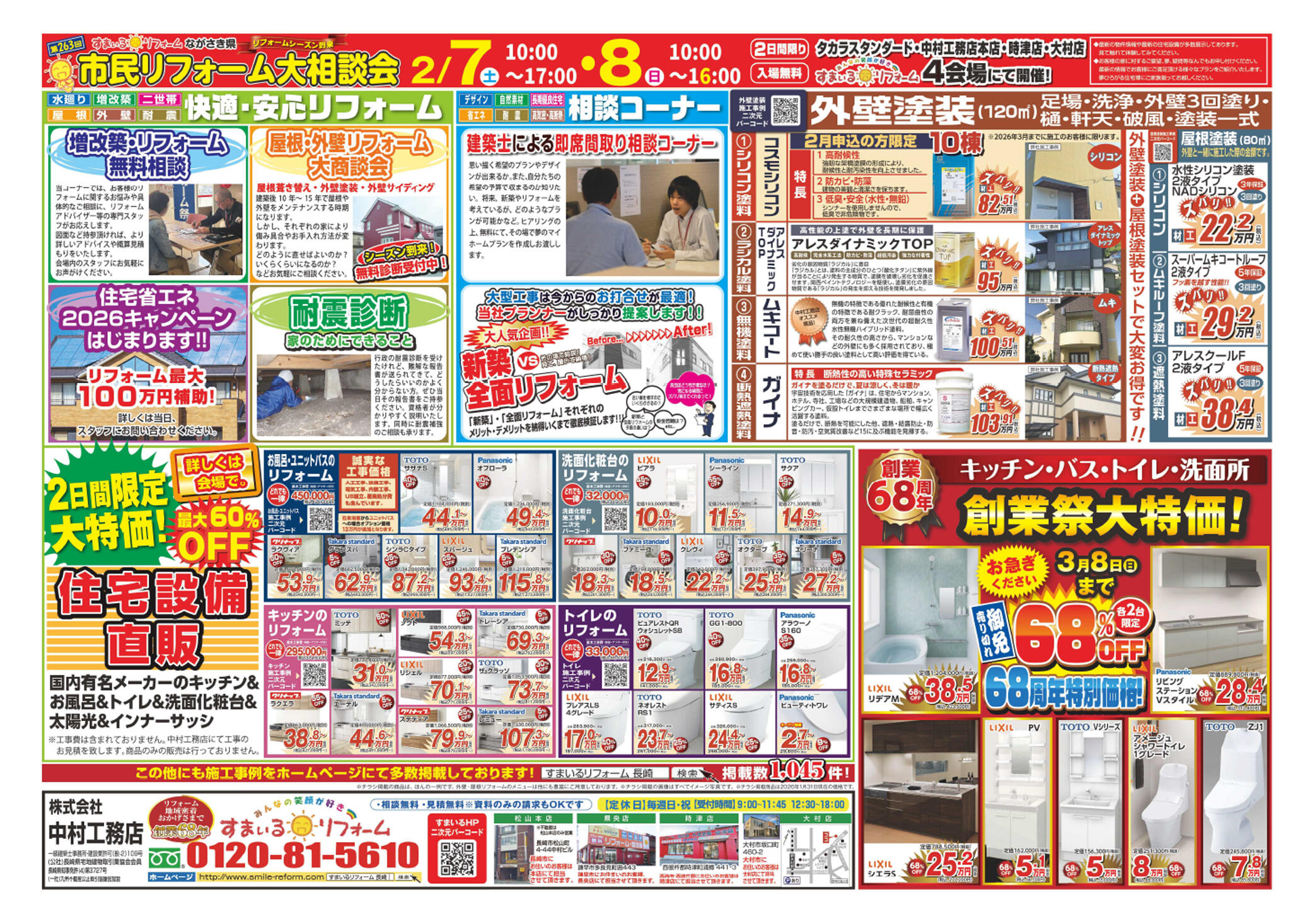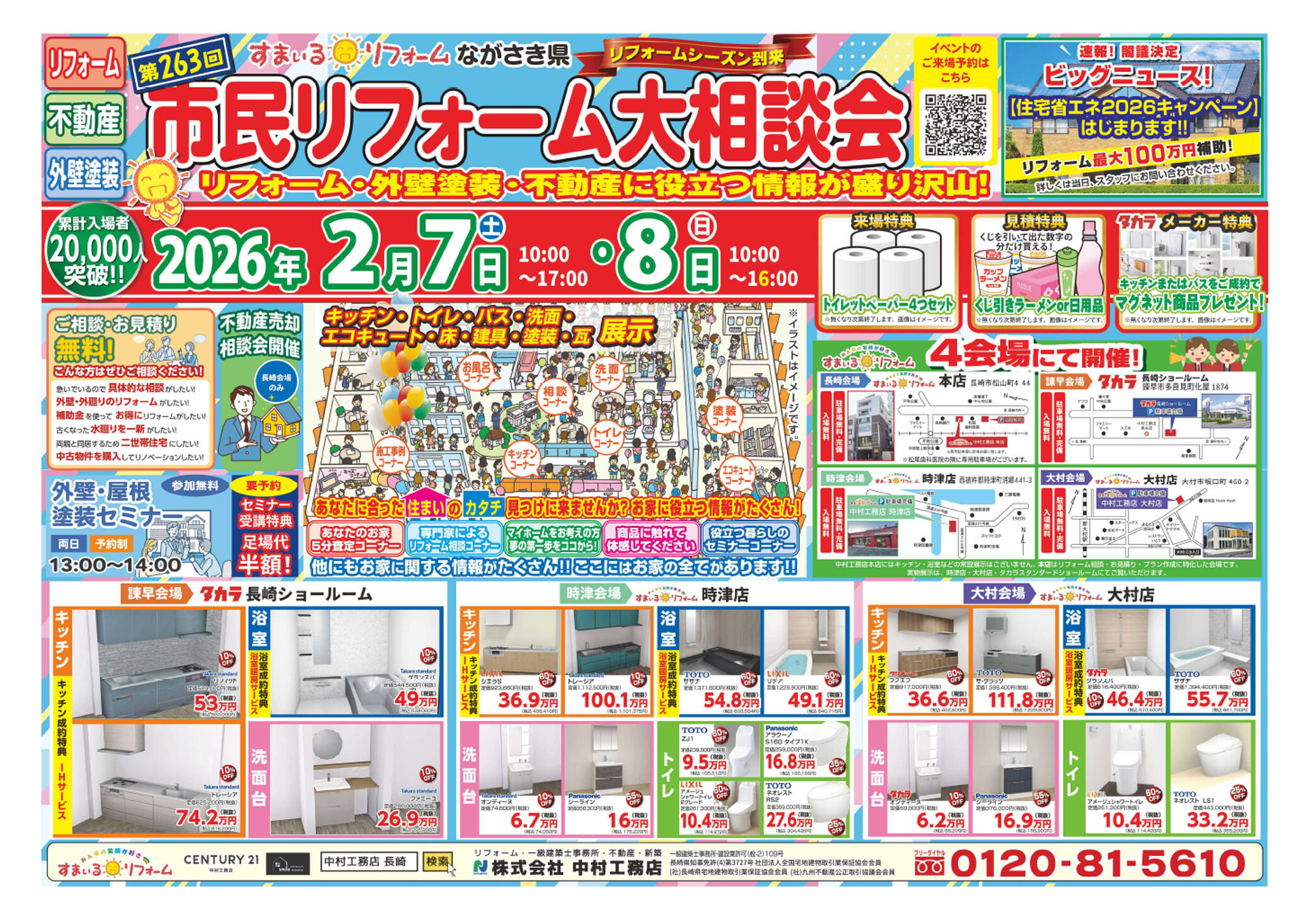 【会場①】すまいるリフォーム 中村工務店 本店/長崎市松山町4-44 、【会場②】タカラ長崎ショールーム/諫早市多良見町化屋1874 、【会場③】すまいるリフォーム 中村工務店 時津店/西彼杵郡時津町浦郷 441-3 、【会場④】すまいるリフォーム 中村工務店 大村店/大村市坂口町460-2