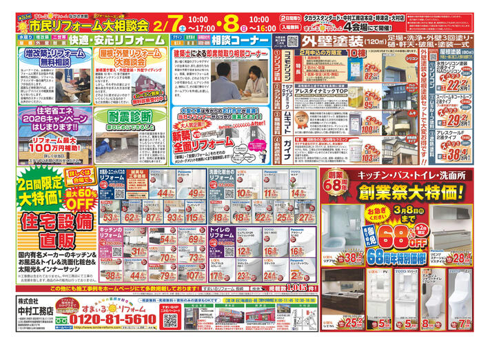 大特価市開催!タカラショールーム、中村工務店 時津店&大村店でお得な商品を多数ご用意しております。トイレ、洗面化粧台、キッチン、浴室などの水まわりや、その他リフォームをご検討の方はぜひご相談ください!
