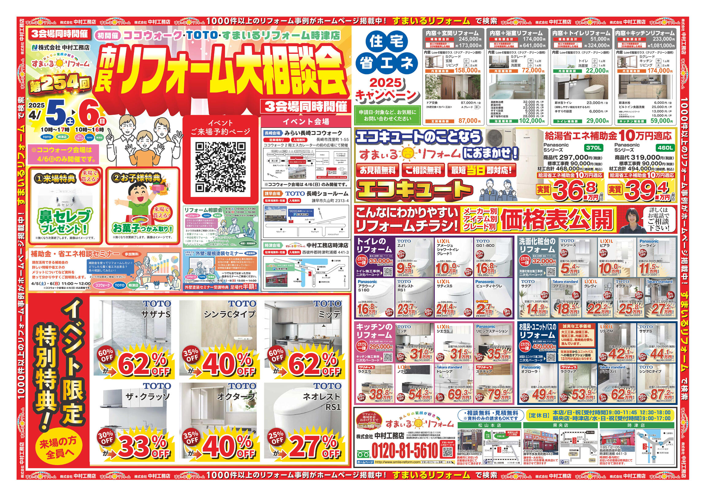 【会場①】みらい長崎ココウォーク/長崎市茂里町1-55 、【会場②】TOTO長崎ショールーム/諫早市久山町2313-4 、【会場③】すまいるリフォーム 中村工務店 時津店/西彼杵郡時津町浦郷 441-3