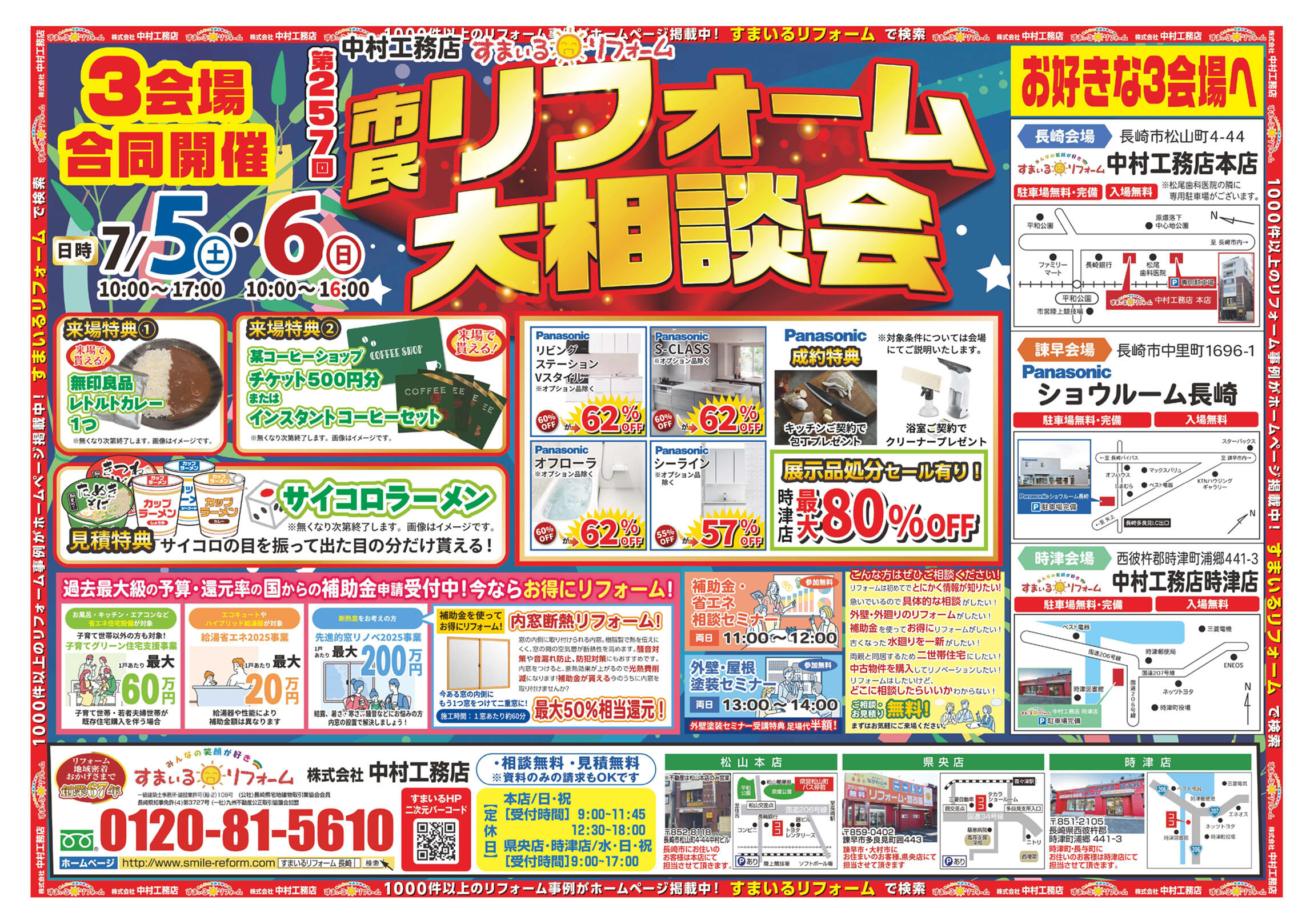 【会場①】すまいるリフォーム 中村工務店 本店/長崎市松山町4-44 、【会場②】Panasonicショウルーム長崎/長崎市中里町1696-1 、【会場③】すまいるリフォーム 中村工務店 時津店/西彼杵郡時津町浦郷 441-3