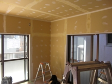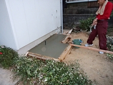| ①2階洋間壁ボード下地のパテ処理 | ②2階洋間の床下地根太組みの調整作業 | ③エコキュート及びヒートポンプ架台のコンクリート打設 |