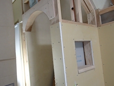 | ④階段下収納部の造作。R開口部とニッチカウンター | ⑤1階LDK増築部分の床下地 | ⑥外壁の塗装作業。ローラーで中塗り中 |